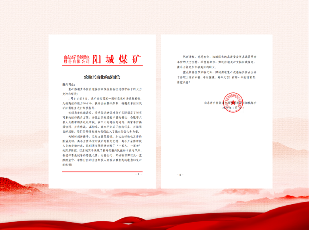 “你们用实际行动诠释了‘一家人 一家亲’的深厚情谊,以忠诚实干展现了新时代融兴队伍的本色与风采,我们怀着最诚挚的感激之情,向贵公司、阳城项目部以及一直默默坚守、辛勤付出的会务帮扶人员致以最崇高的敬意和衷心的感谢!”。近日,融兴商业收到了阳城煤矿对融兴商业及其阳城项目部,在国家一级标准化矿井达标验收迎检期间给予的大力支持与帮扶表达了诚挚谢意。阳城煤矿迎检期间,融兴商业选派优秀餐饮、会服人员,携带充足物资对后勤服务进行帮扶指导。“匠心兼程 精诚协作”,融兴商业用优质的服务和卓越的品质,对兄弟单位鼎力支持,在关键时刻伸援手,无私支援见真情,用忠诚与实干彰显了新时代融兴队伍的卓越风采,最终两家企业高效协同、并肩作战,以高标准、高水平完成了此次达标验收工作。服务有温度,满意无终点,融兴商业将不断提升服务品质,强化企业之间的通力合作,以真诚细致的服务,守护“物业人”初心,携手共促“双赢”的全新局面,描绘出灿烂辉煌的发展蓝图。■文 |宋海英(安全品控部)图 | 谷聪聪(市场营销部)