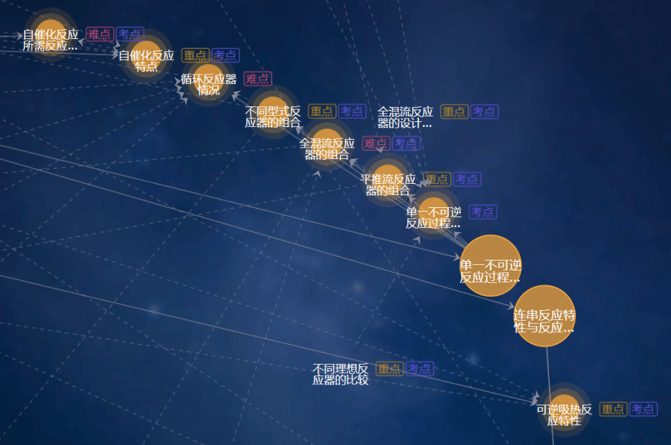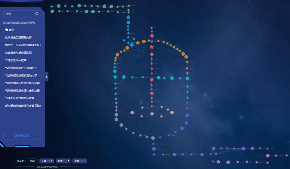《化学反应工程》课程涵盖大量的理论知识,如反应动力学特性、流动和传递过程、反应器设计和过程分析及优化等,这些内容抽象且复杂,许多学生在学习过程中可能会感到困难。为了帮助学生更好地理解和掌握这些知识,课程图谱将化学反应工程的概念、原理、公式、案例等知识点有机串联,共建设146个知识点。设置重点、考点、难点并梳理知识点的前后置关系,形成清晰的知识网络,以可视化的方式呈现出完整的化学反应工程知识体系,帮助学生清晰把握知识脉络,形成了完成的课程图像。此外,创新设计知识图谱的视觉效果,以全混流反应器的外形特征为灵感,巧妙融入课程元素,提升了学习的趣味性。