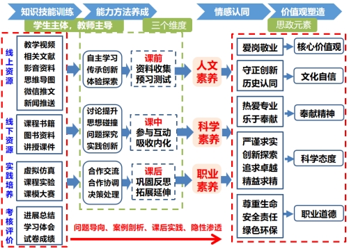 从“人文-科学-职业素养”三个维度出发,梳理化学反应工程的“思政元素”,将爱岗敬业、守正创新、热爱专业、精益求精、尊重生命等思政元素融入到课程思政建设体系中去。将课程所具有的思政元素与知识点建立思政图谱,实现知识传授和价值引领相统一。利用智慧课程平台开展专题讨论、思政视频观看、资料查阅、分享展示等自主性学习,线下课堂进行案例分析、分组讨论、答疑解惑等引导性教学活动,形成教师主导、学生深入参与,全面、立体的有温度的思政学习方式。