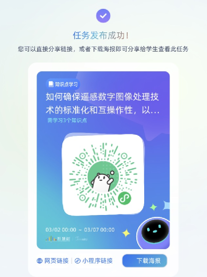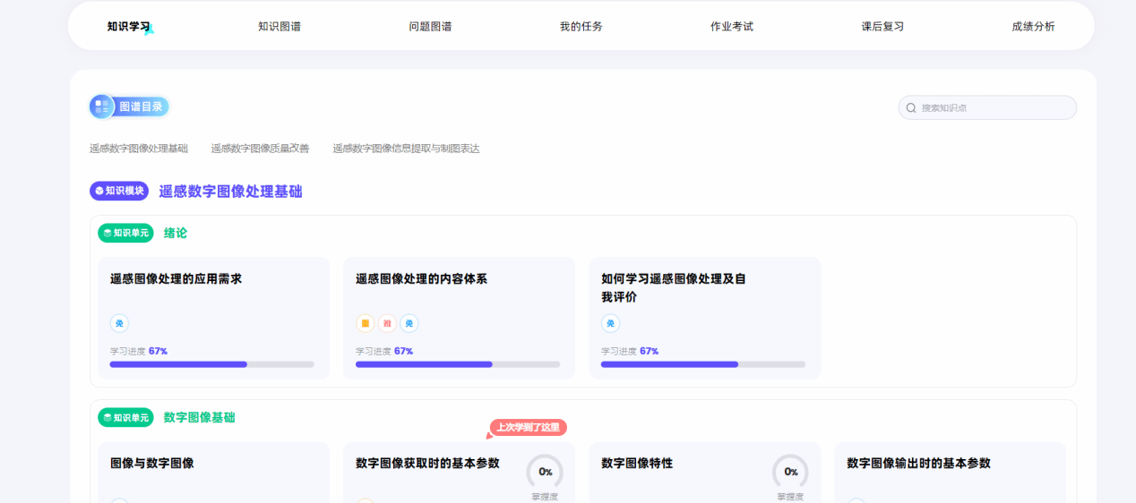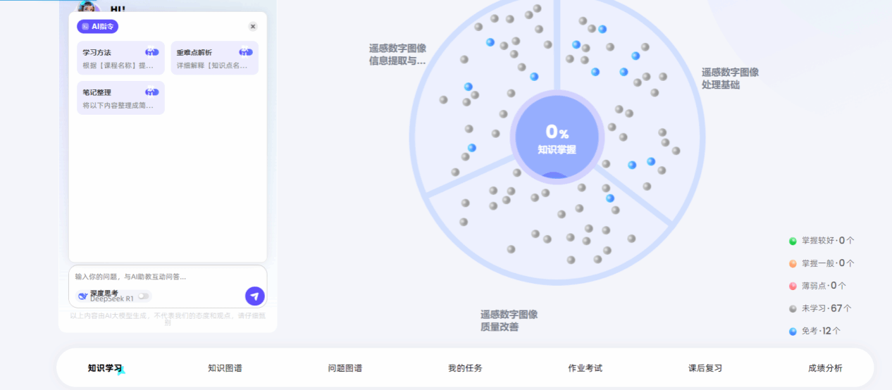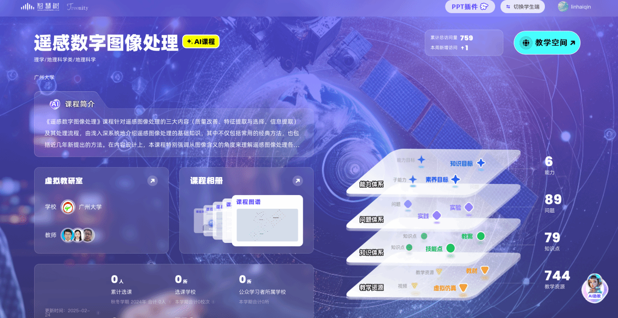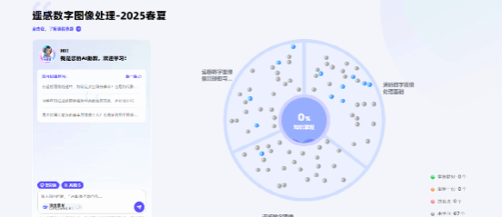 我校地理科学与遥感学院骆仁波老师团队积极推动课程数智化赋能,携手智慧树网建设《遥感数字图像处理》AI智慧课程,目前已上线智慧树平台(访问地址https://smartcourse.zhihuishu.com/course/index/1831996039457017856?mapVersion=1)。本课程是在知识图谱建设的基础上,升级打造成为AI智慧课程,包含79个核心知识点,覆盖387个知识节点、3个知识模块、744个教学资源。