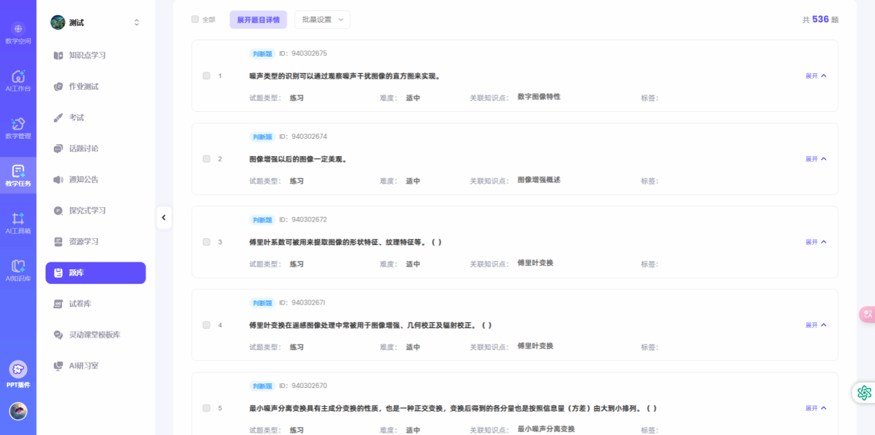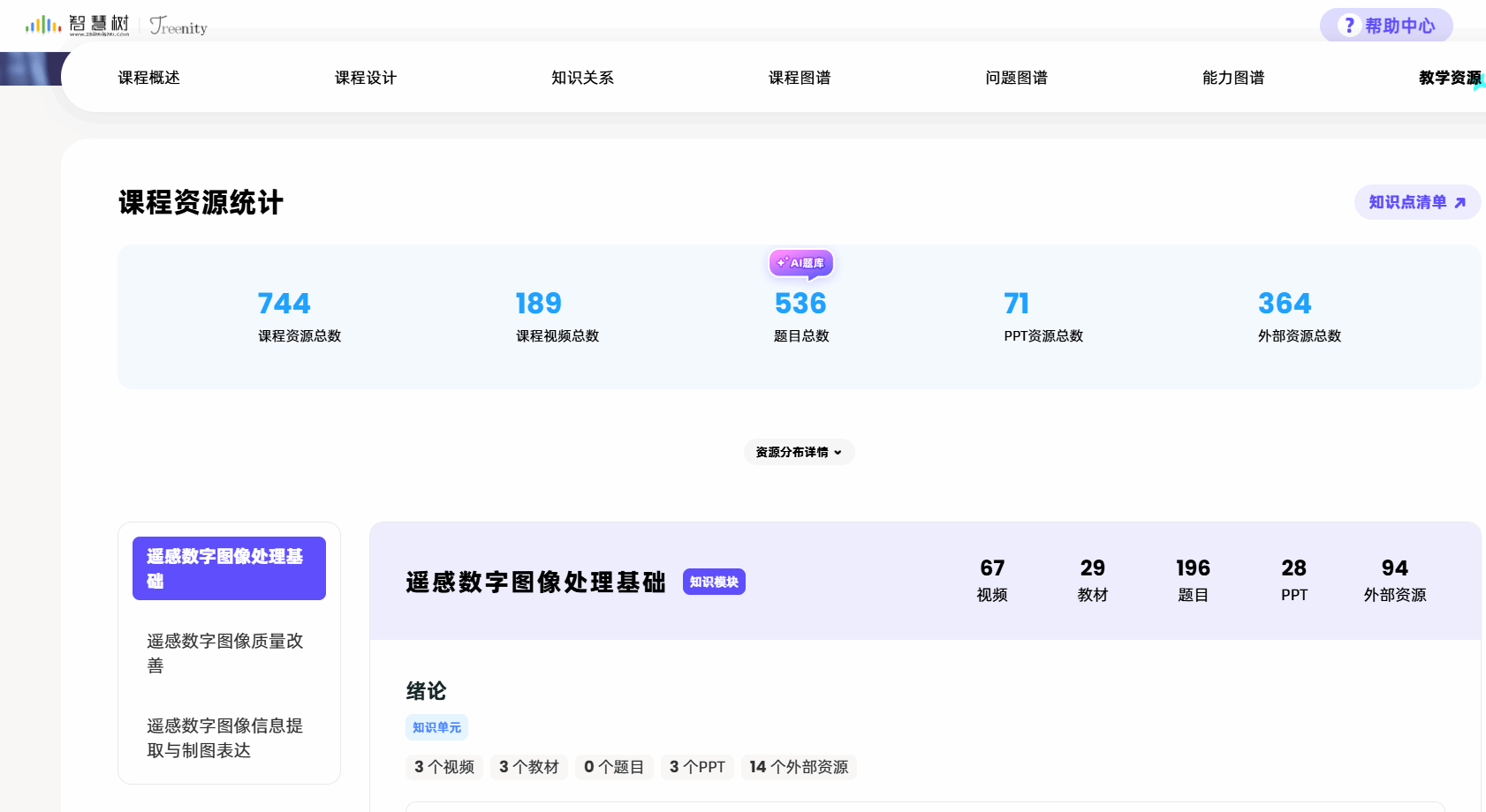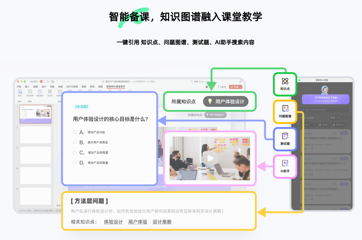 课程配备了智能备课系统,基于课程建设资料库自动梳理知识点、问题图谱和测试题,实现资源一键引用、课件一键生成,提高教师的备课效率。
