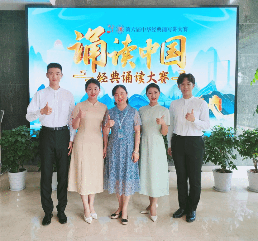 ▲图4 张爱凤教授(中)指导学生参加经典诵读大赛全国总决赛,获一等奖