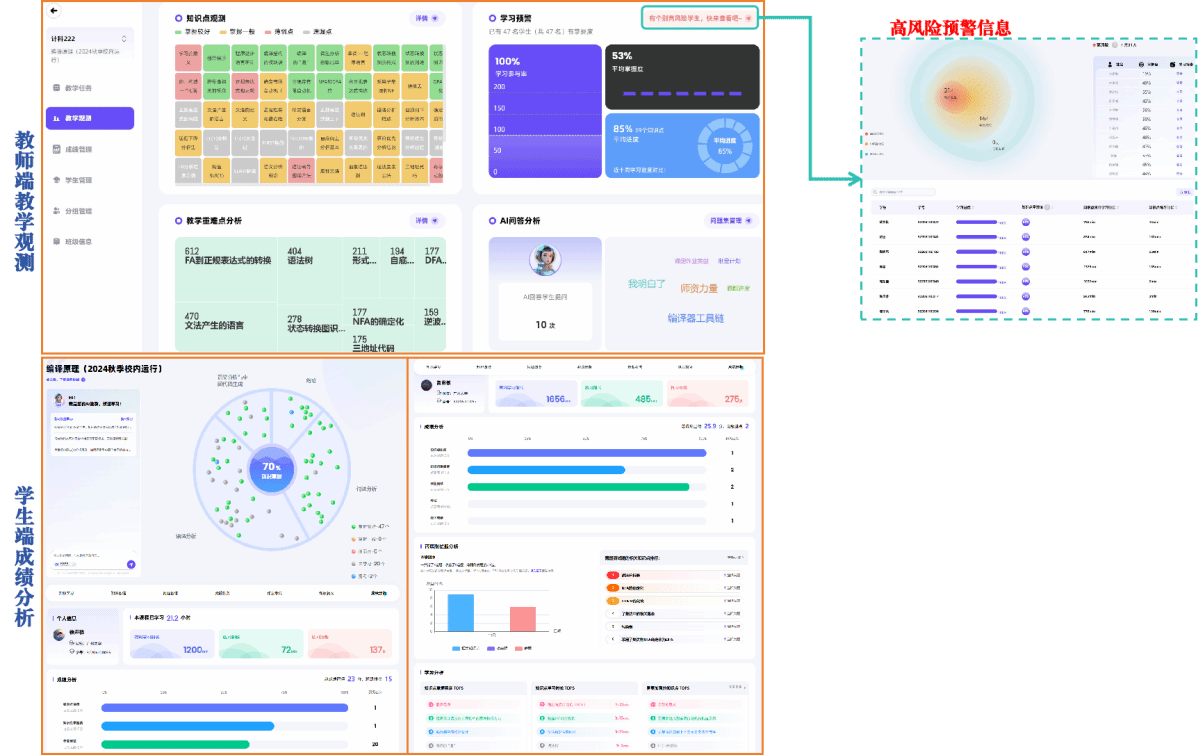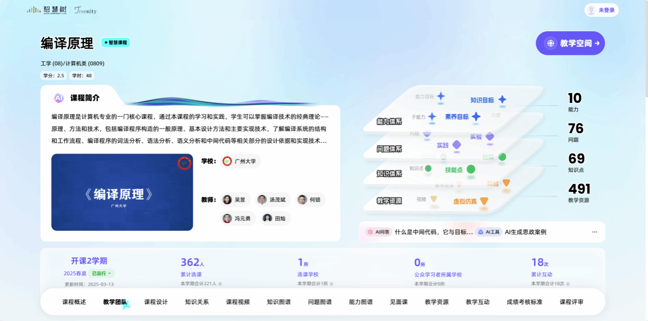 为了全面提升教学质量,课程团队不断探索创新,开展了多期融合智能识别技术与自动模块化分解技术的编译原理探索性实验教学,共同研发了智能管控解题过程的线上综合主观题答题系统,智能辅助引导学生完成各项画图、建表等复杂答题步骤,真正实现了整个答题过程的线上自动评阅,同时能精准检测到学生具体出错的位置并给出参考建议。2025年年初该系统正式挂载在智慧树平台供学生使用。经过升级后的AI智慧课程,贯通了“教—学—练—评—研”的“全链智教”智慧教育闭环,设计了五重护航的智慧学习系统,为专业核心课程建设及课堂教学创新注入了新能量。