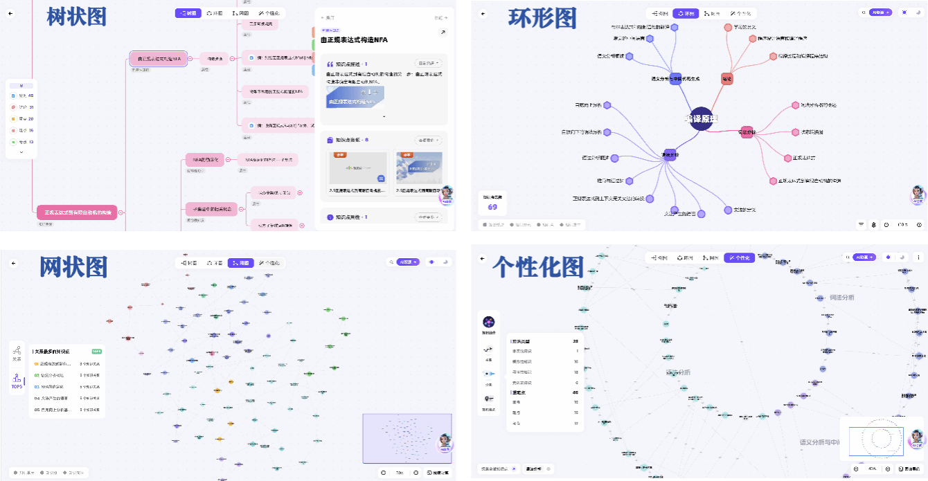 在学生学习端,智慧平台打造了碎片化学习云库,为课程学习提供智能关联的多模态资源及24小时智慧学伴。学生通过课程首页的“知识点卡片”,能快速了解自身学习进度、知识点掌握程度以及课程重难点。从“知识点学习空间”进入,学生可获取各知识模块完整学习资源,包括配套视频、练习题、关联教材文本、PPT及外部拓展等多模态资源;也可从各类课程图谱页面进入,课程图谱以树状、环形、网状等多种形态展示编译课程中各知识节点间的包含、递进、依赖或共生关系,学生点击图谱节点即可查看对应知识点学习资源。