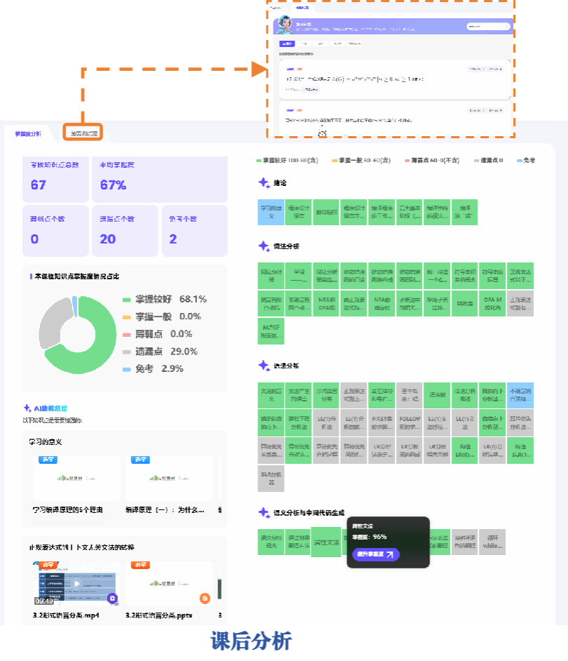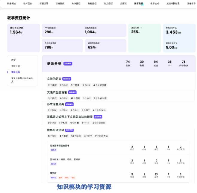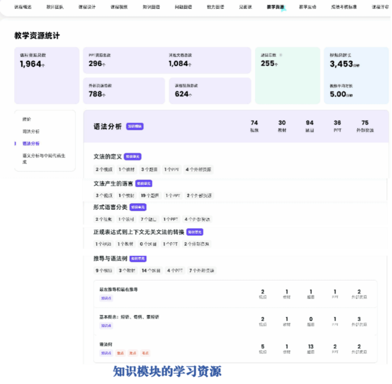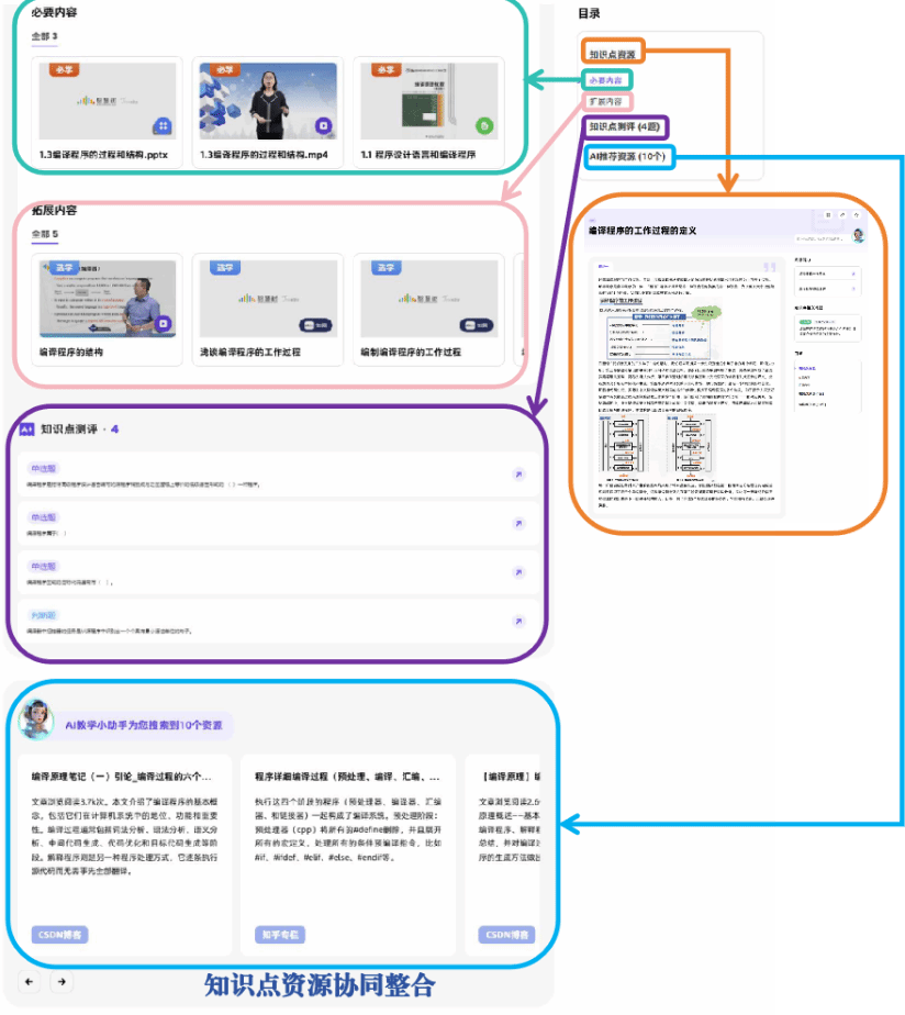运用大模型技术,对课程的内部资料库(包含视频、图谱、教材、题库等)以及通过检索爬取的外部资料进行自动梳理整合,同时借助AI搜索推荐知乎、百度百科、CSDN博客等知名网站上与编译知识点相关的补充说明。将编译过程各阶段模块细化,以微小知识点为单位重新整合内外资源,并通过数字讲堂对具体概念、理论方法及应用进行讲解。这一举措不仅使学生能够突破时间与空间的限制进行学习,还打破了资源壁垒。
