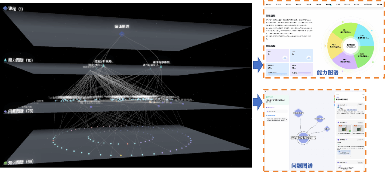 本课程具有理论性强、实践环节复杂等特点,教学上存在一定的难度。智慧平台依据课程内容构建了知识图谱、能力图谱、问题图谱三维可视化关联网络(图12),动态关联教学资源与学习路径,支撑教研决策与课程优化。此外,学生可通过知识点学习后来到问题图谱,在应用层面上查看知识点与问题的内在联系,并通过习题巩固知识点的掌握程度,提升课程教学效果。