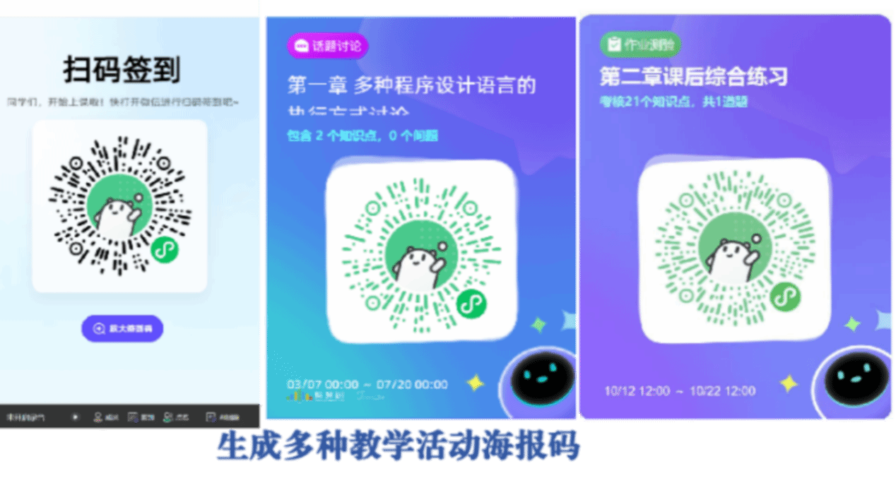 此外,教师组织的线上线下、课上课下教学活动,如通知公告、单元练习、签到点名等,均可通过平台生成对应二维码,方便师生查看与布置。