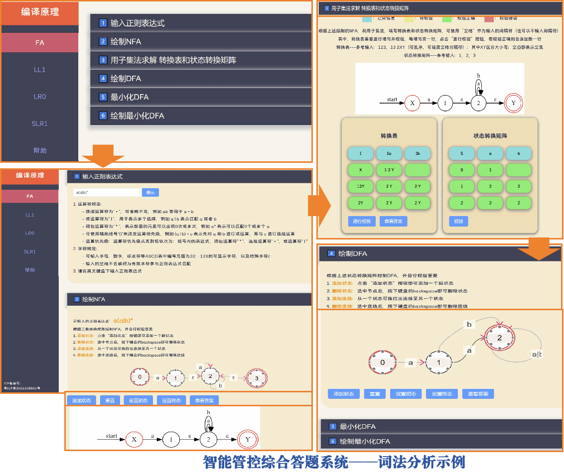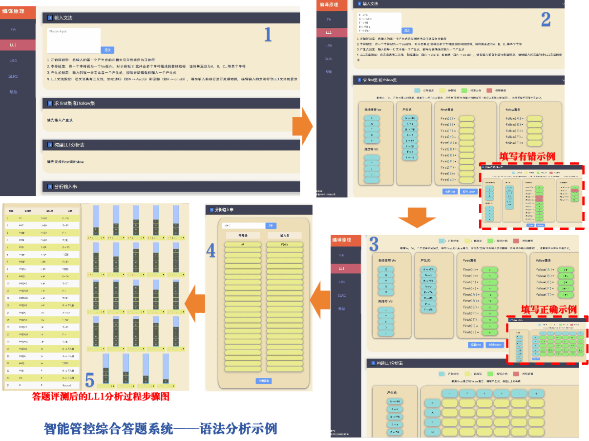 本课程经常涉及专业图表分析、设计和绘制的教学。囿于“AI自动出题”功能难以实现推理计算等综合主观题的智能化评测,课程团队和本课程的优秀学员们开拓创新,共同研发智能管控综合大题答题系统。图9和图10中展示了词法分析和语法分析示例答题过程,学生可在系统上按要求输入任何待分析的正规式或文法、输入串等,只有在上一步回答正确的情况下才能进入下一步,在每步回答时系统给出不同引导信息辅助学生分析已知条件,并设置了每步回答多次修正机会,实现了完全意义上的智能线上作答和自动过程监督的“新智慧式”评测。尤其是LL(1)、LR(0)和SLR(1)三种语法分析模块,系统在答题评测后会给出详细的分析表展示,以及语法分析示例中栈模拟计算机内部存储的过程细节。