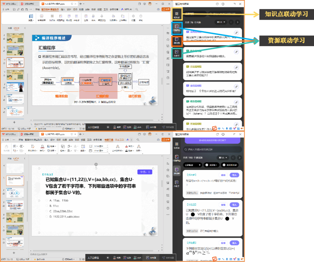 通过PPT插件,知识图谱中的各项内容均可智能关联线下课堂的课件,教师可采取知识点联动学习、资源联动学习等多种方式(图13)以新的形态将线上平台和线下课堂进行融合贯通,实现真正意义上的线下线下相辅相成的混合教学。