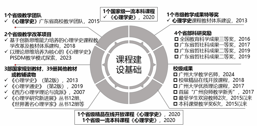 自2011年起,杨文登老师以课程负责人的身份将《心理学史》从校级优质理论课程、在线开放课程、思政示范课程,逐步建设为广东省一流本科课程、国家级一流本科课程。在此期间,杨老师主持获批省级教学改革项目2项,并依托广东省在线开放课程,制作了超300分钟的心理学史教学视频,近3000人在学堂在线选课修习。同时,他还撰写与翻译了心理学史教材4部,在九游ag网页版直接进入_九游(中国)慕课平台自制了2800分钟视频资源及387个习题,合建"心理一二三"公众号并发布了70余篇心理学史科普文章。