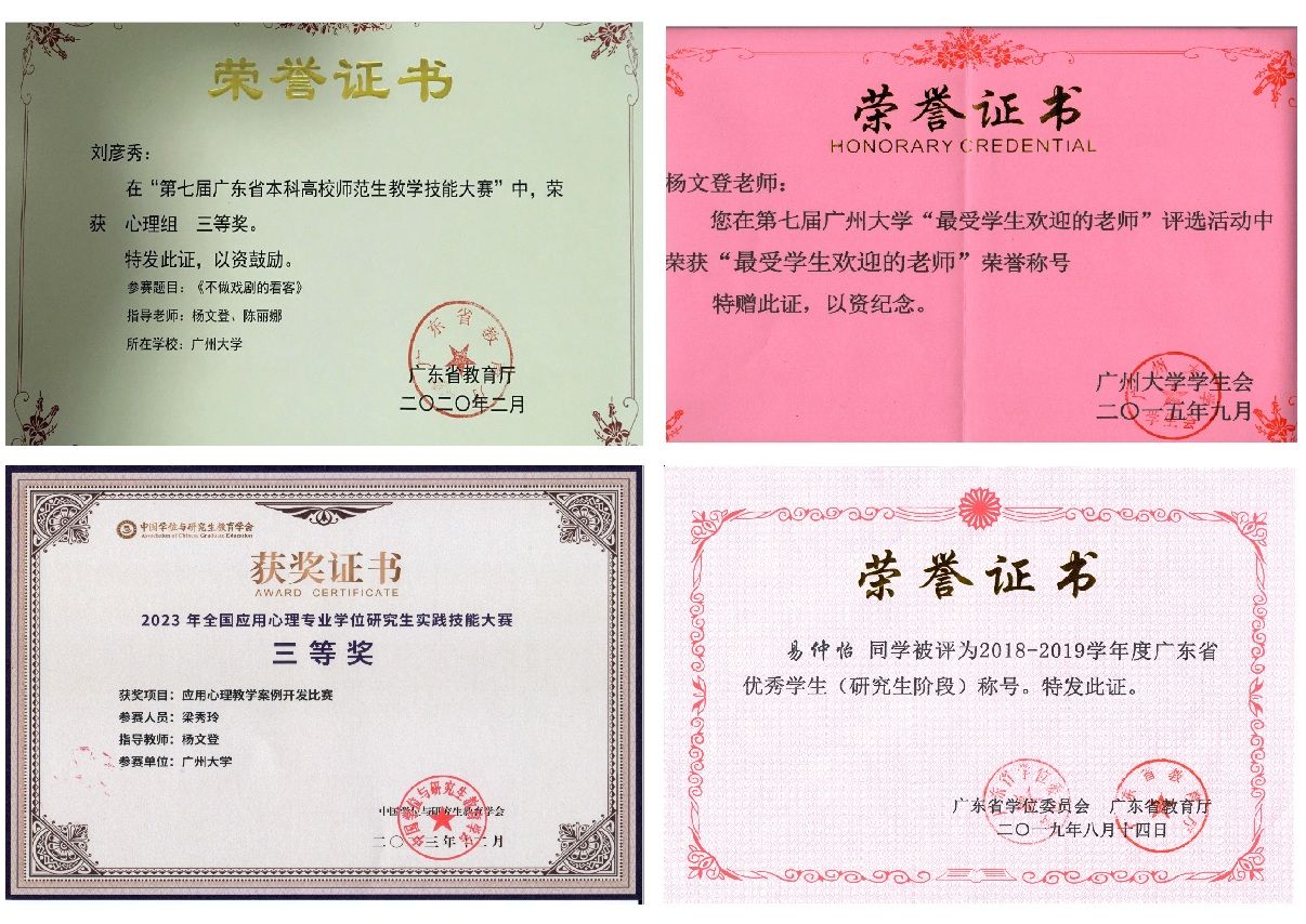 杨文登老师始终坚持以本为本,热心课堂教学,近10年年均本科生教学工作量395学时。在教学过程中,强调基于研究证据,以问题为中心,通过比赛促进专业学习与技能成长。指导本科生获广东省心理学师范技能大赛三等奖2人次、省级创业项目1项;指导硕士研究生获“广东省优秀研究生”1人次、获教育部应用心理硕士教指委与教育专业硕士教指委组织的专业技能大赛奖励5项。杨老师的教学风格深受学生喜爱,获得九游ag网页版直接进入_九游(中国)首届 “广州良师”(教学新秀),第二、三届 “广州良师”(C档);第六、七届九游ag网页版直接进入_九游(中国)“最受学生欢迎的老师”,近10年获得本科课堂教学一、二等奖7次。