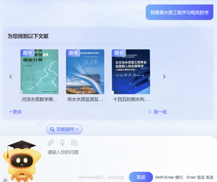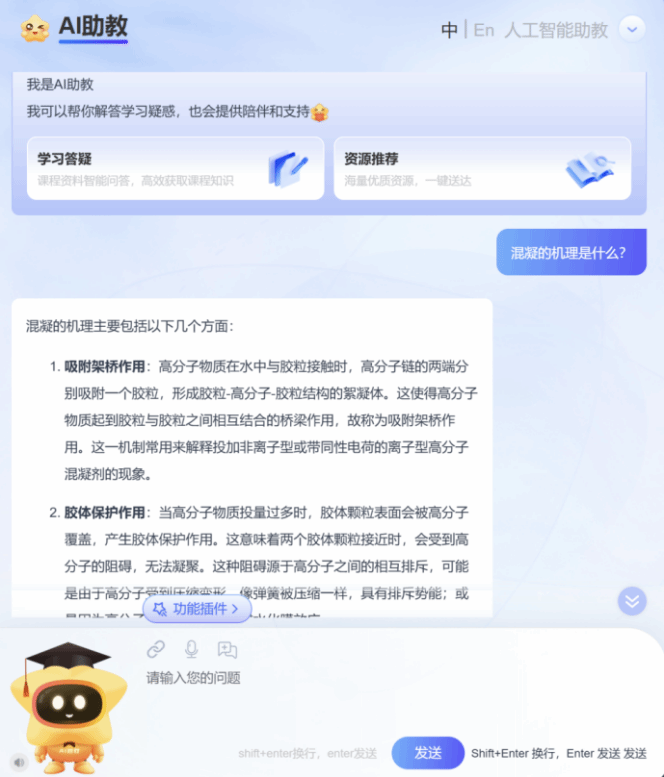 - 全程学习辅导:训练专属的AI助教,实现课程相关的智能问答、资源推送,为学生提供24小时随时随地的辅导(图11)。自动链接《水泵与泵站》《给水管网》等关联课程知识点,方便学生对课程知识相关的内容进行搜索与拓展,构建专业认知网络(图12)。