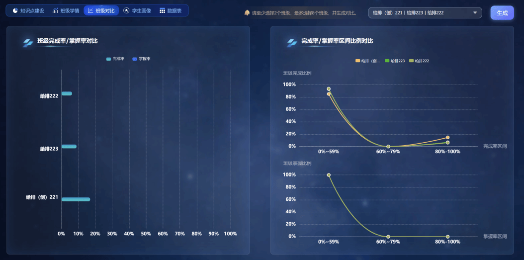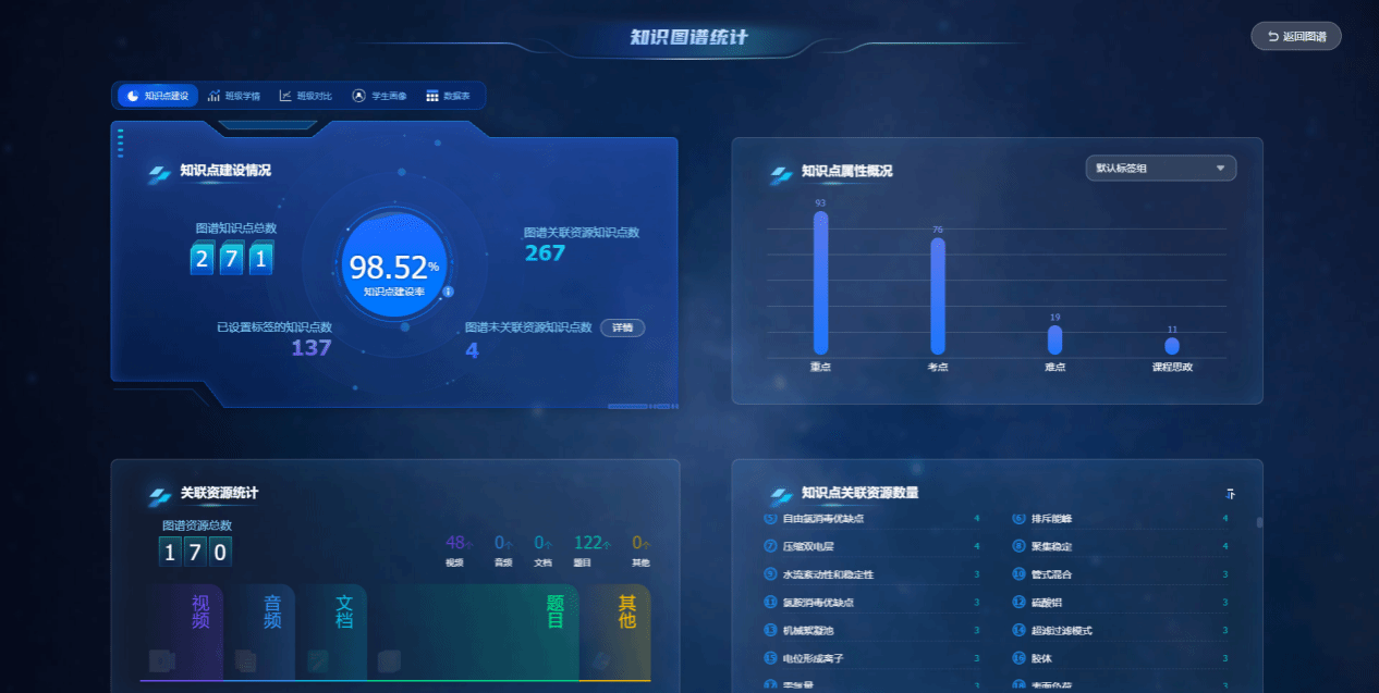 - 精准教学统计:通过数据可视化展示班级整体的学习进度、知识完成与掌握情况、知识热度,帮助教师了解学生的学习习惯,调整教学计划和教学方法;对比不同班级的学习情况,包括任务完成率和课程掌握率等指标,了解每个班级的课程进度,协助调整教学安排(图10)。