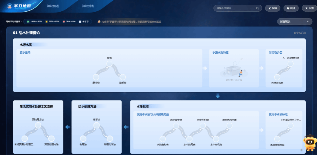 突破传统“填鸭式”教学桎梏,构建“学习轨迹跟踪-智能诊断-精准干预”的闭环系统。在学生自主学习的过程中,系统根据知识图谱掌握度自动生成“专属学习地图”(图5-6),实时跟踪学习进度,分析学习薄弱点,提供针对性的提升建议。例如,对于混凝动力学等难点模块,AI系统智能推送清华大学许保玖院士的经典论文解读、珠三角水厂运行案例等差异化学习资源,实现“千人千面”的教学适配。