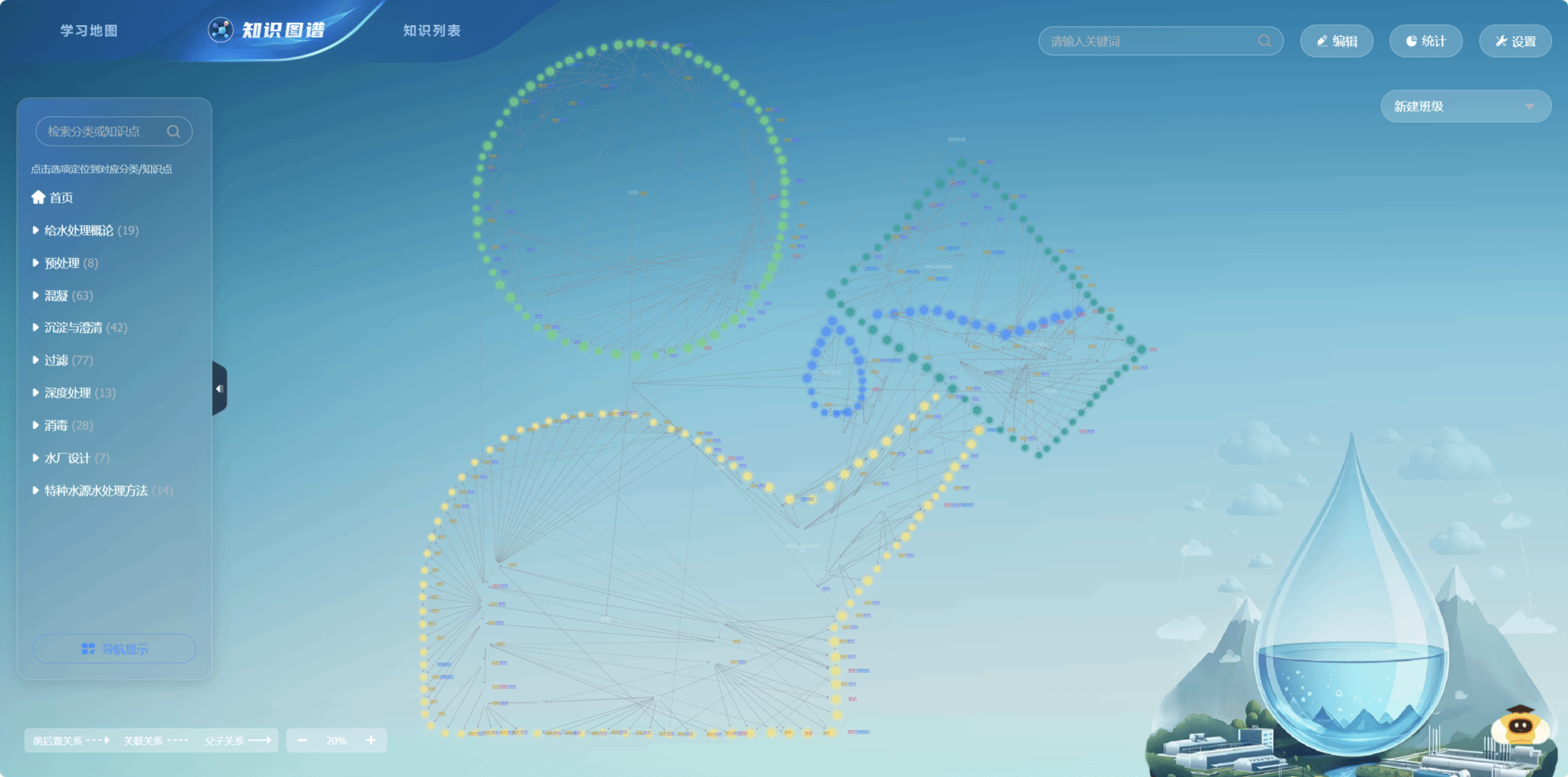《水质工程学Ⅰ》知识图谱构建起涵盖271个知识节点的三维智慧教学体系,以“混凝-沉淀-过滤-消毒”工艺链为主轴,将97项国家水质标准、48类处理单元、23种新型技术有机串联。通过三维可视化界面,学生可自由切换“工艺原理-设备结构-设计计算”学习视角,系统掌握从原水特性分析到净水厂工艺比选的全流程知识。图谱特别设置“技术迭代轴”,动态关联超星资源库中126篇前沿论文、45项专利技术,确保教学内容与行业技术发展同步更新。