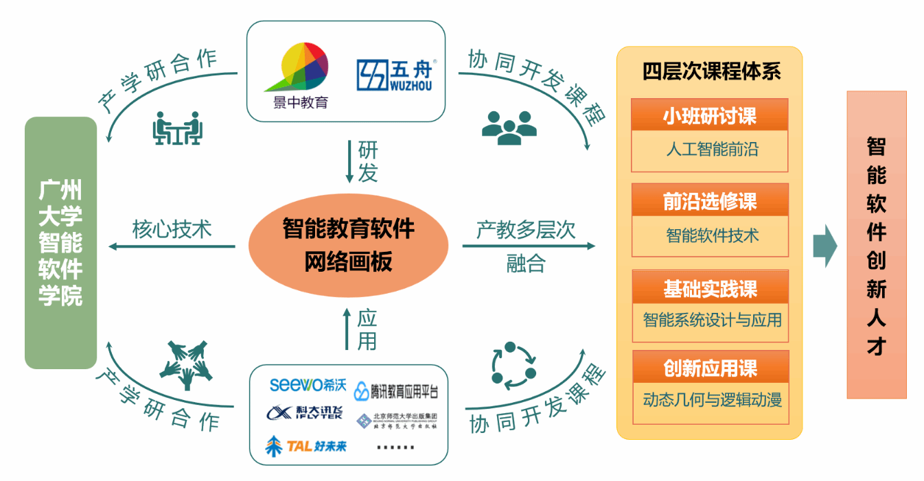 基于团队在数学机械化、人工智能及教育信息技术等领域的创新研究成果,结合校企协同研发网络画板的过程,开发特色化创新课程,形成了四层次课程体系:①小班研讨课,解析、攻关理论与技术难点;②前沿选修课,深入学习行业前沿知识和技能;③基础实践课,培养学生的程序设计能力;④创新应用课,提升学生智能软件专业化应用服务能力。
