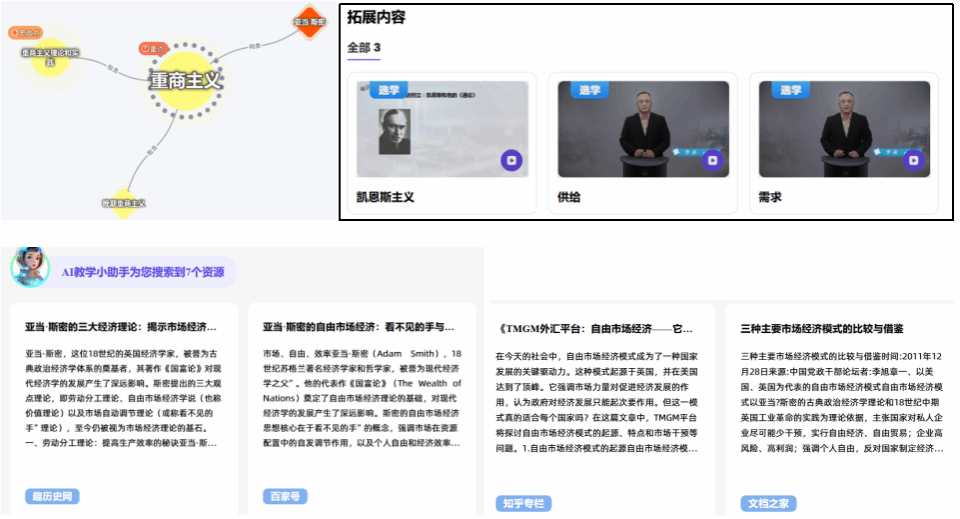 课程依托智慧树平台,搭建覆盖全课程的动态知识图谱,包含170个核心知识点、519个知识节点、478个教学资源,形成结构化、可视化的知识网络。例如,“重商主义”不仅关联历史事件,更延伸至亚当·斯密的经济自由主义理论、凯恩斯主义等经济学内容,辅以AI推荐的学术视频,实现“历史-经济-技术”的三维贯通。