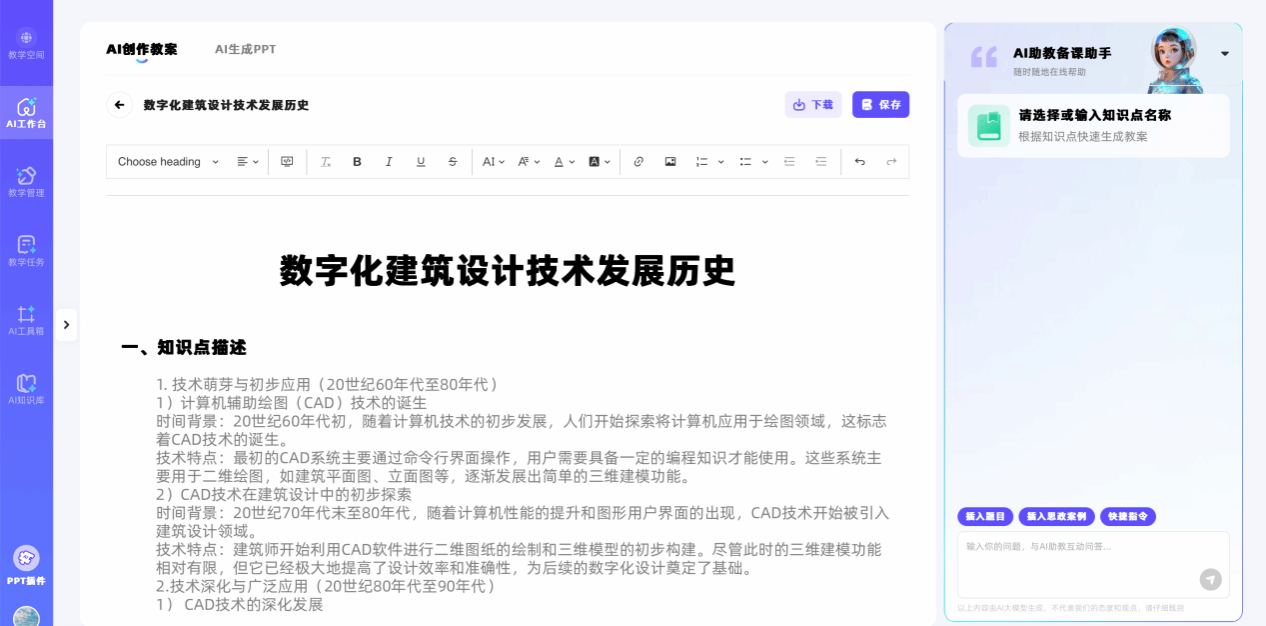 PPT一键美化:教案内容可同步生成结构化课件,并适配建筑学科视觉风格;