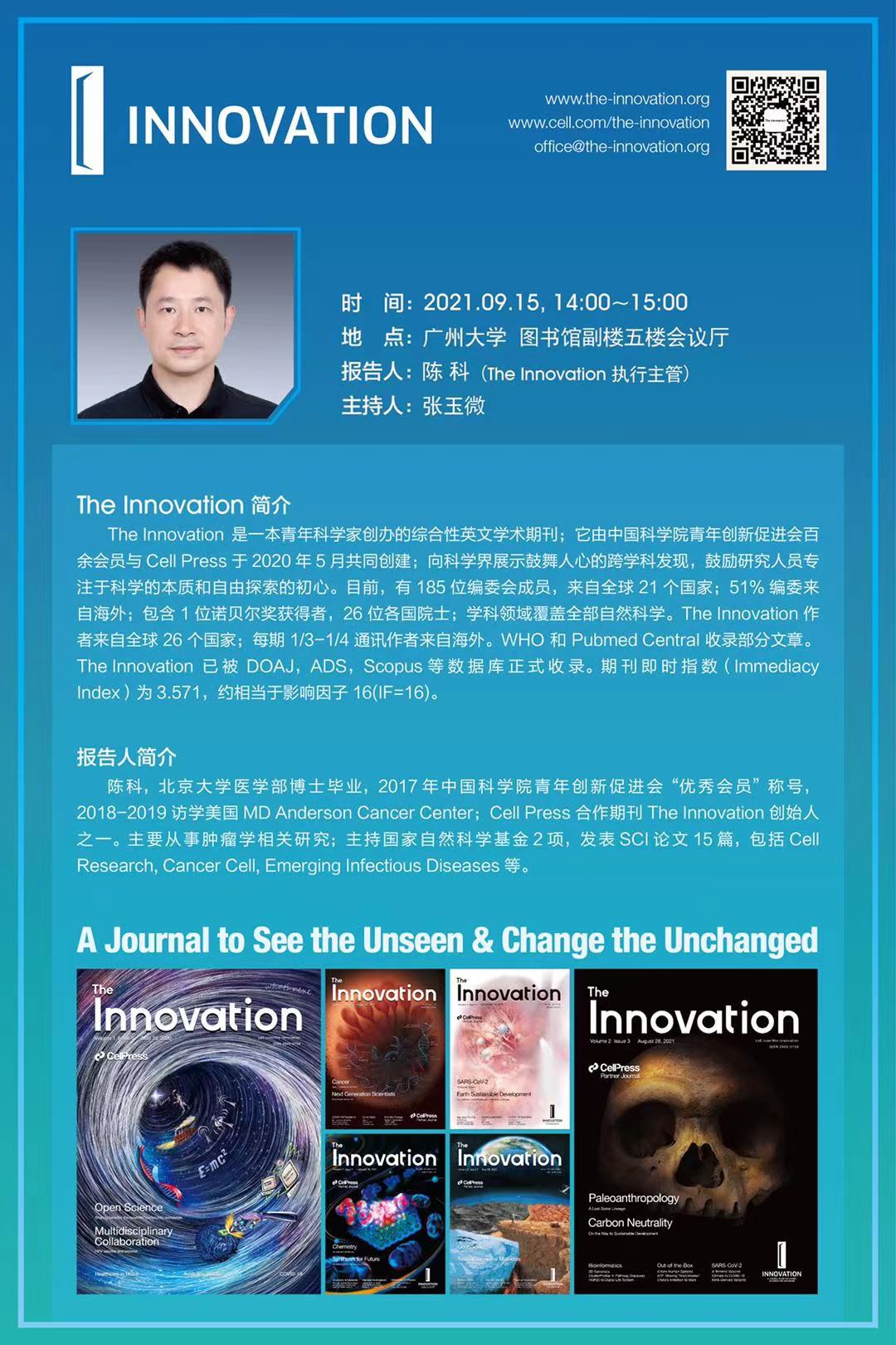 青年博士联谊会与国家优青张玉微教授共同邀请The innvoation期刊陈科执行主编来九游ag网页版直接进入_九游(中国)讲座。定于9月15日14:00点在图书馆副楼五楼会议厅。欢迎大家积极参与!