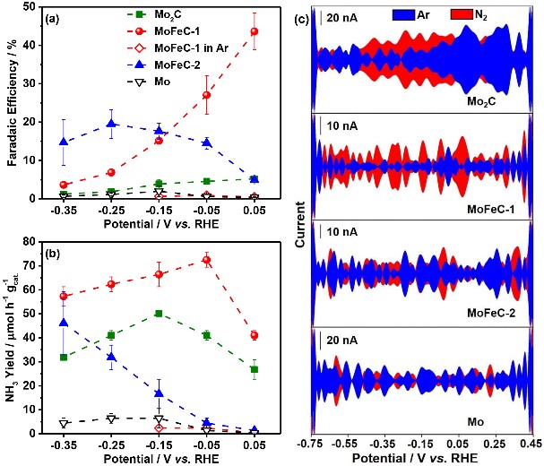 彭峰教授团队受生物固氮酶活性位点(Mo-Fe)的启发,研究合成了用于ENRR的钼铁碳化物(Mo3Fe3C)电催化剂,该催化剂在电化学氮还原反应中,氨产率为72.5 μmol h-1 gcat.-1,稳定性好,10 h生产氨的平均法拉第效率为28.2%;理论计算表明,Mo-Fe协同作用可以有效活化N2分子,降低ENRR过程中形成*N2H所需的能量,促进了N2的电化学还原;该研究创新性地采用傅里叶变换交流伏安法(FTACV)来表征ENRR过程中的电子转移,这是一种快速、灵敏、有效的评价催化剂ENRR性能的方法。本研究为设计与评价高活性、高选择性的ENRR催化剂提供了新的思路和方法。彭峰教授为该论文的通讯作者,九游ag网页版直接进入_九游(中国)为论文唯一通讯单位。