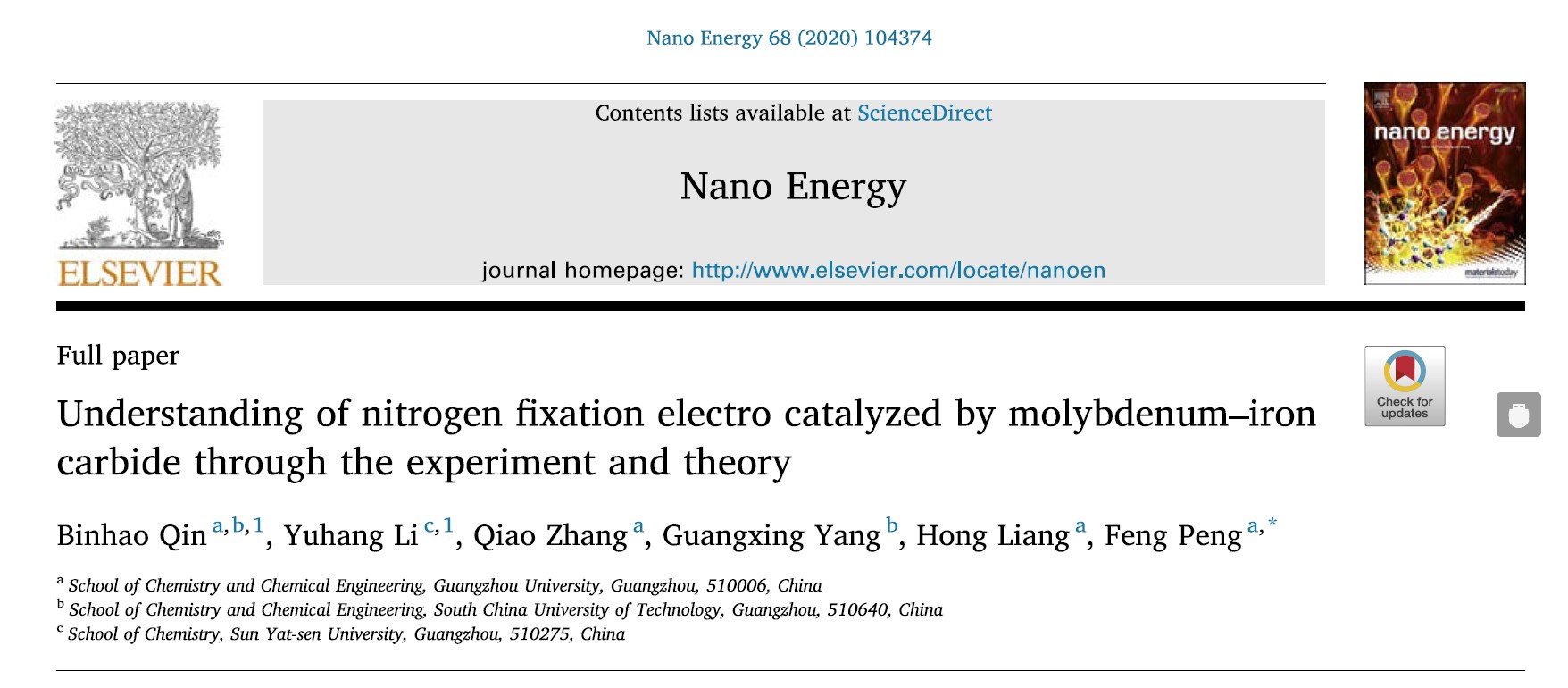 近日,国际能源顶级期刊《Nano Energy》(IF= 15.548)发表了我校彭峰教授团队最新研究成果。