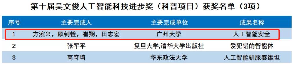 我校方滨兴院士团队的成果《人工智能安全》获吴文俊 人工智能科技进步奖(科普项目)
