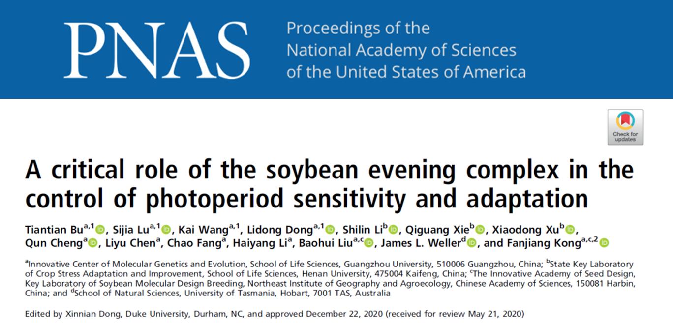 2. Bu T, Lu S, Wang K, Dong L, Li S, Xie Q, Xu X, Cheng Q, Chen L, Fang C, Li H, Liu B, Weller JL, Kong F (2021) A critical role of the soybean Evening Complex in the control of photoperiod sensitivity and adaptation.PNAS10.1073/pnas.2010241118.