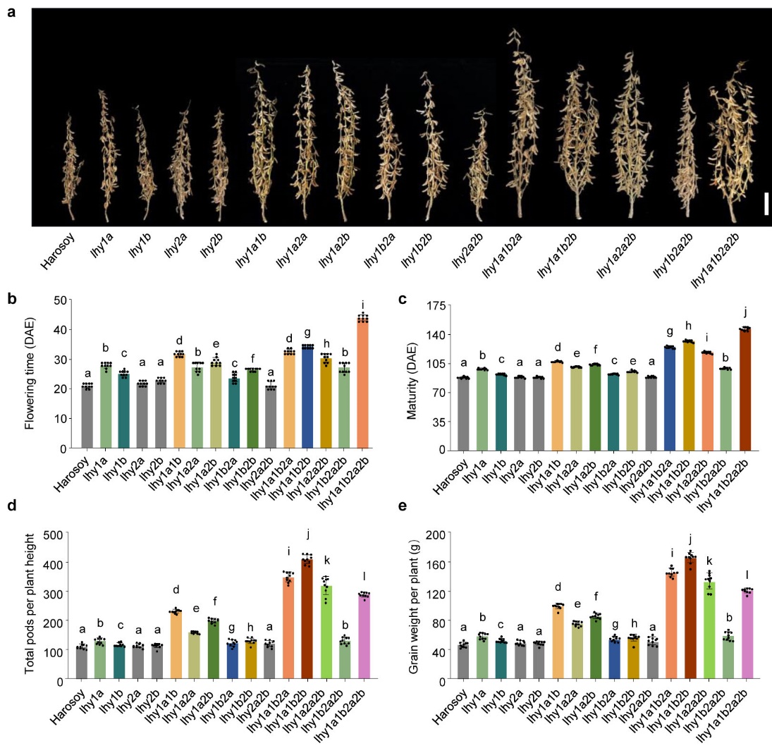 2021年9月14日,九游ag网页版直接进入_九游(中国)生命科学学院/分子遗传与进化创新研究中心的孔凡江和刘宝辉研究团队以九游ag网页版直接进入_九游(中国)为第一通讯单位,在国际杂志 Nature Communications上发表了题为 “Genetic basis and adaptation trajectory of soybean from its temperate origin to tropics” 的最新研究成果。该研究揭示了大豆由温带起源地向热带低纬度地区适应的遗传基础和适应轨迹。利用基因组学,生物信息学和经典正向遗传学的方法,发掘了在低纬度地区 (短日照条件下) 控制大豆开花期的新位点 Tof16,图位克隆后发现Tof16位点由生物钟基因LHY1a编码。在短日照条件下 Tof16 的功能缺失等位变异显著的延长大豆开花期和提高大豆产量。分子机制解析表明 Tof16 通过直接调控 E1基因的表达,进而调控大豆的光周期开花。同时,我们利用基因编辑技术获得了Tof16 在大豆中四个同源基因的15种突变体,表型观察发现四个同源基因在调控大豆开花期和产量上是功能冗余的。