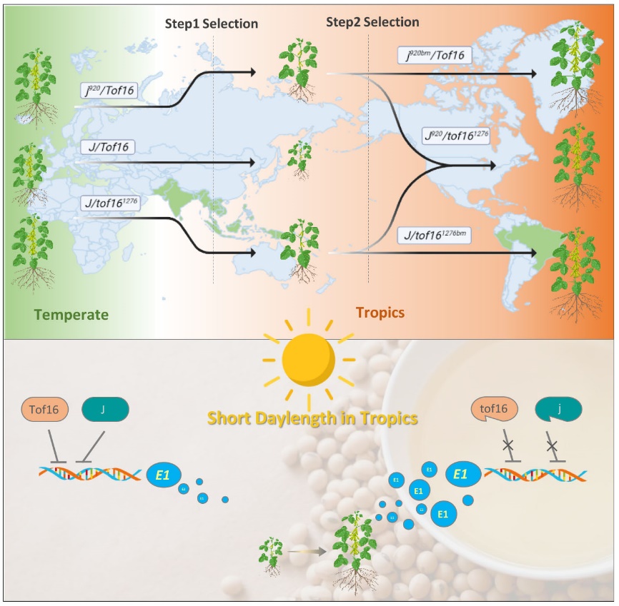 大约5000年前,栽培大豆在我国黄淮海区域(北纬32-40度)由野生大豆驯化而来,在我国的农业生产和粮食安全中占据着重要的地位。直到上世纪90年代以来,科学家们发现并应用了两个重要的控制大豆长童期性状的位点J和E6,进而使热带低纬度地区大豆种植面积得到了快速扩张。目前,巴西已成为世界第一大大豆生产国,同时来自于低纬度地区的大豆产量已经超过全世界大豆总产量的一半。然而,大豆是光周期极为敏感的典型短日照作物,单个品种或种质资源一般只适宜种植于纬度跨度较小的区域内,那么起源于温带黄淮海区域的大豆是如何适应热带低纬度地区生态环境的呢?又是如何影响大豆的产量和在世界范围的种植和分布呢?