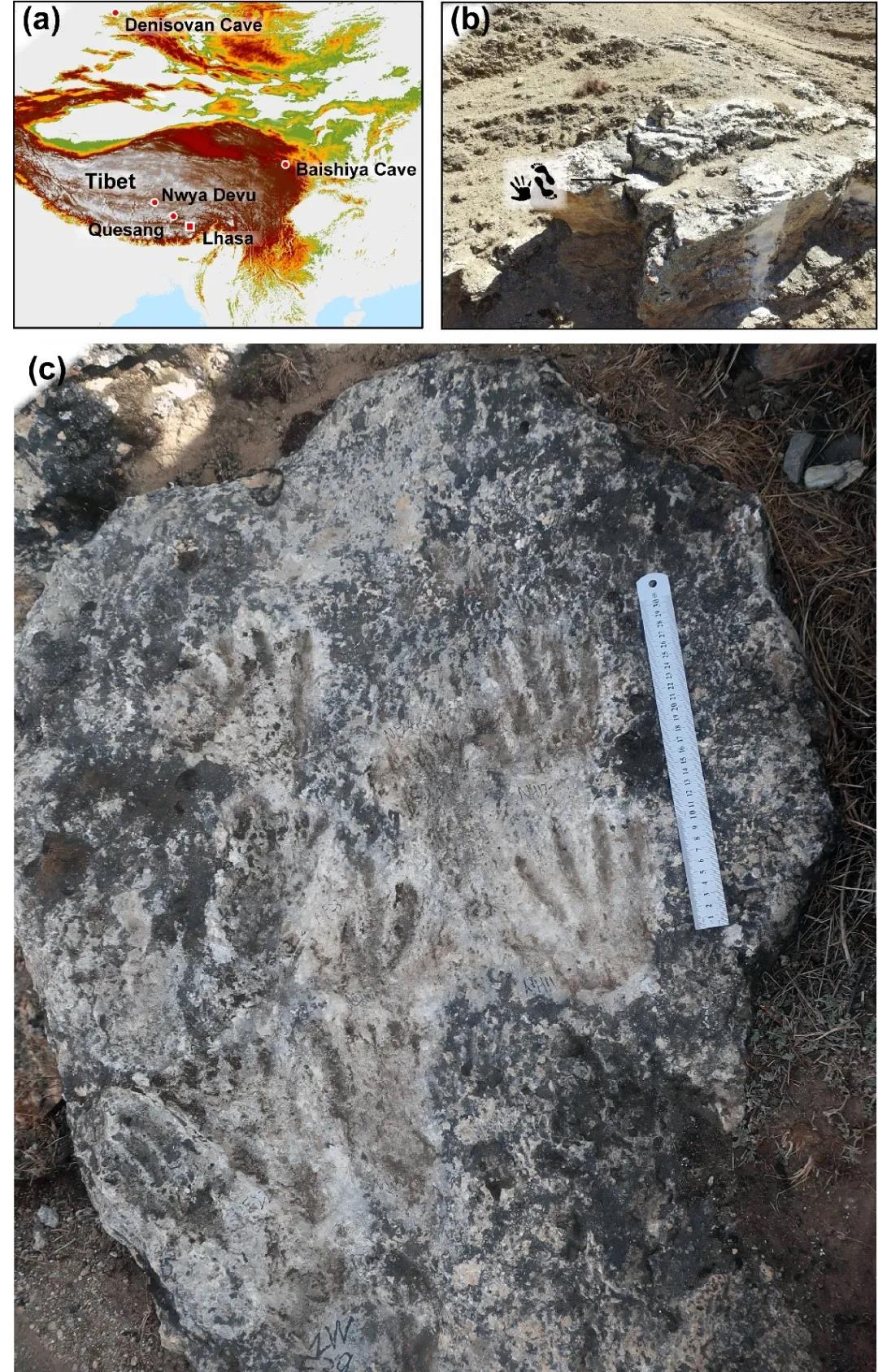 图2 西藏邱桑古人类手脚印遗迹。(a)区域背景显示了其它关键的古人类发现地点。(b)岩面艺术的位置背景(如箭头所示)。该遗迹处于一块突出的岩角上方,由于上覆的块体被自然移除,岩面艺术暴露在其中一个块体的表面。(c)原始岩面艺术。