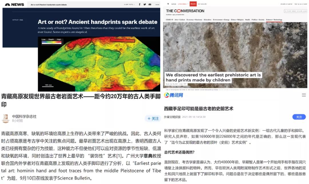 2021年9月10日,我校章典教授领衔的国际团队在高水平期刊《Science Bulletin》在线登载题为《Earliest parietal art: hominin hand and foot traces from the middle Pleistocene of Tibet》的文章。章典教授为第一作者兼共同通讯作者,讲师王蕾彬博士、张盛达博士,研究生王晓晴,博士后李腾博士以及吴志峰教授为共同作者。文章目前处于期刊预较样阶段,尚未正式发表,即迅速在国内外引起广泛关注(图1)。
