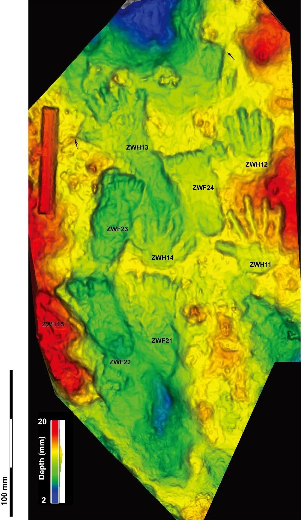 时间回到2018年10月,在参加“第二次青藏高原综合科学考察研究”的过程中,章典教授、王蕾彬博士、研究生王晓晴在拉萨市堆龙德庆区邱桑温泉附近的古泉华沉积(海拔约4060米)上发现了一组古人类手脚印,包含5个手印和5个脚印(图2)。在团队成员对手脚印拍照、测量,并在手脚印附近及其所处钙华层进行取样的基础上,章典教授团队联合世界顶级足迹学家、英国伯恩茅斯大学的Matthew R. Bennett教授团队,以及著名铀系定年专家、西安交通大学的程海教授团队分别从形态学和年代学两个方面对这些手脚印进行研究,此次发表的文章即为该国际团队历三年打磨之结晶。