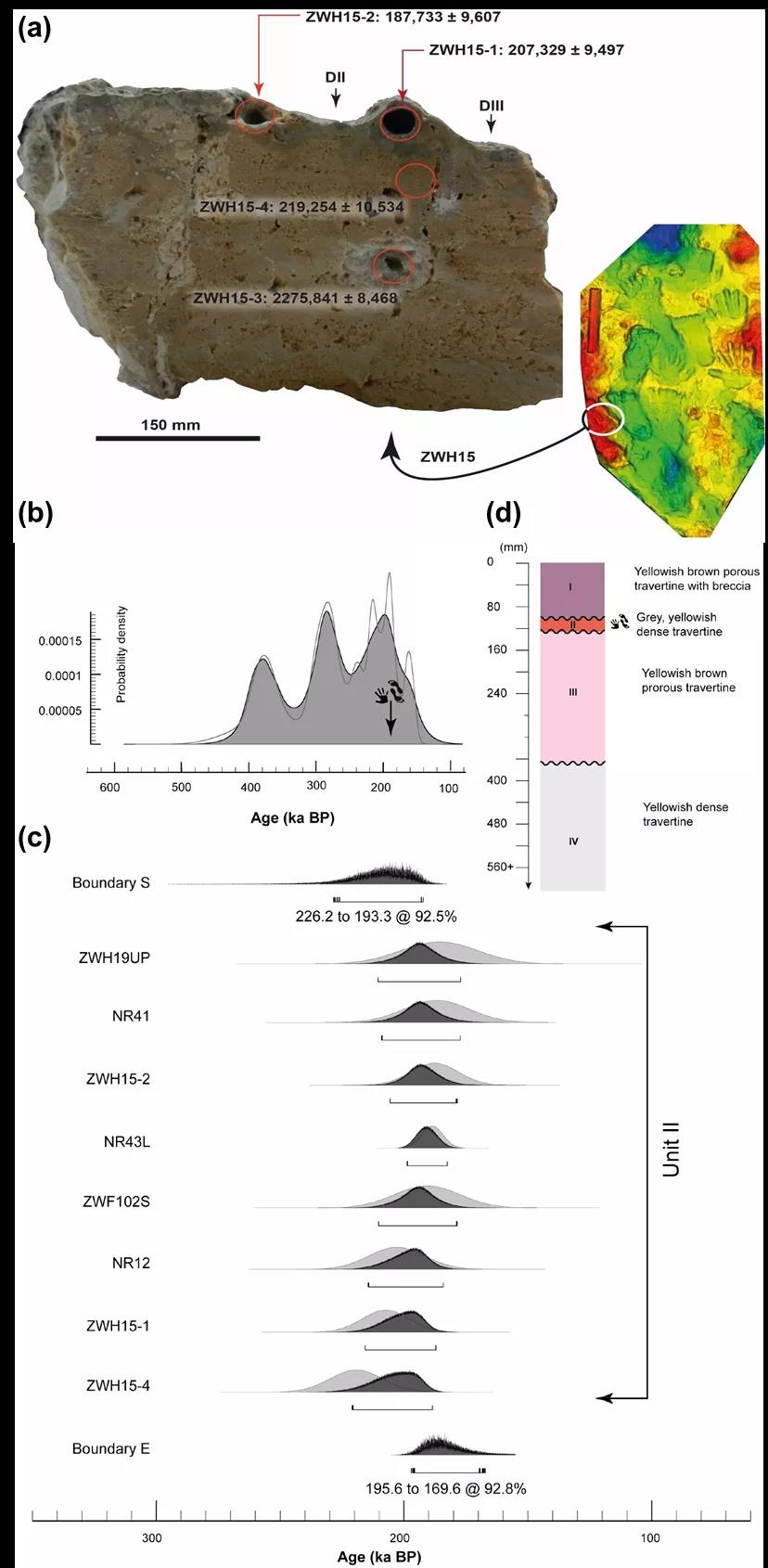 通过对这些手脚印进行3D建模(图3)和形态学定量分析,并结合现代人手脚印解剖学特征推测,文章认为它们是在泉华没有成岩之前由古人类压上去的,而且很可能是两个孩童。他们或许在温泉边的软泥中嬉戏,觉得软泥中自己的印迹非常有趣,从而有意识地“创作”出世界上最古老的原始艺术。对手脚印所处钙华层及附近多次取样并反复进行U-Th定年,结果(图4)表明这块“艺术岩板”表层U-Th年龄为距今约16.9-22.6万年,其中还包含了一个手指印的直接测年年龄(约18.7-20.7万年)。