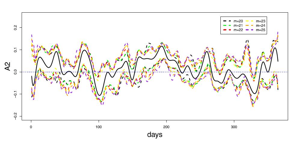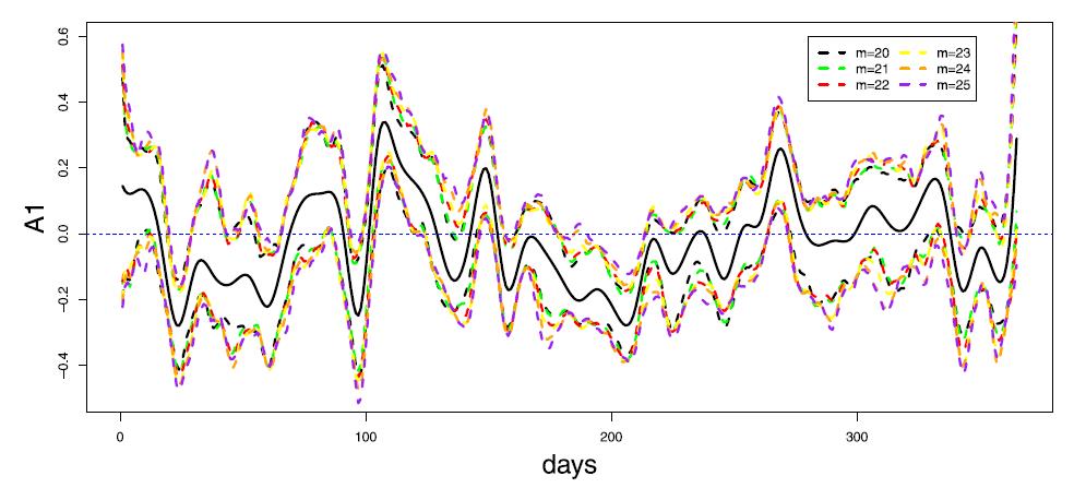 文章主要研究了含有无穷多个交互效应项的函数型线性模型的预测问题。在基于函数型自变量和多个标量自变量预测农作物产量时,发现引入这两部分自变量的交互效应可以提升预测效果。文章在函数型线性模型中引入交互效应,并假设交互效应依赖于标量自变量的一个单指标结构。接着结合函数型主成分分析的降维方法和平均最小方差估计方法给出了模型的估计。模型中允许函数型主成分得分的个数趋于无穷,文中证明了模型中参数部分的估计是根号n相合且渐近正态的,模型的预测误差由交互效应中非参函数的估计误差控制。根据预测误差的性质,还提出了基于交叉核实的参数选择方法。