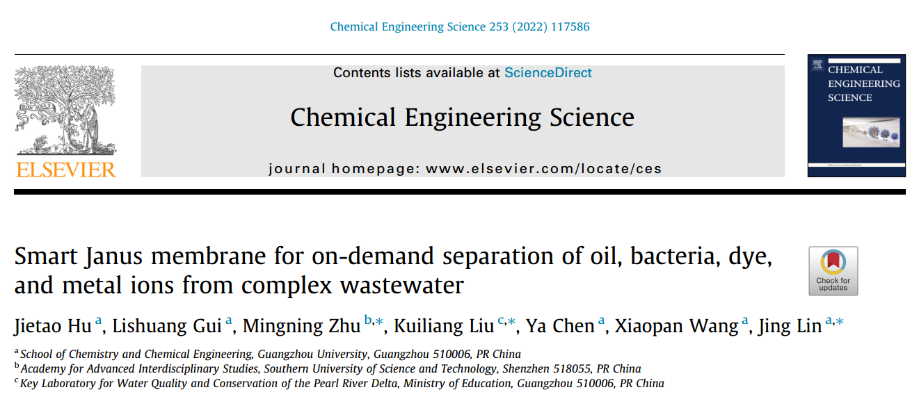 该成果发表在化工领域国际知名期刊《Chemical Engineering Science》。 该策略提供了膜材料良好的设计思路,以实现复杂体系的高通量和高效按需分离,油水分离通量和分离效率分别达到4917 L m-2h-1 bar-1和99%以上,且具有突出的有机染料(>98.6%)、金属离子(>99.7%)和细菌(>99.7%)去除率,形成了含细菌/染料/油复杂废水的智能响应型复合膜分离技术,该工作将为按需实现高通量和高效率的膜材料设计提供参考,该技术有望在未来大规模应用于工业和实际生活中的复杂废水的处理。文章链接:https://www.sciencedirect.com/science/article/pii/S0009250922001701