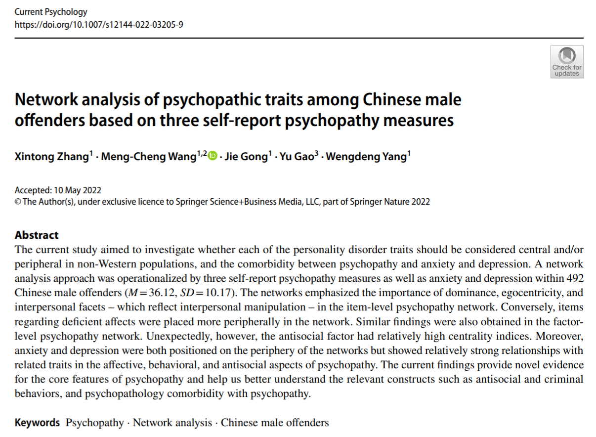 近日,教育学院心理系王孟成副教授在心理学领域重要期刊《Current Psychology》上发表题为“Network Analysis of Psychopathic Traits Among Chinese Male Offenders Based on Three Self-Report Psychopathy Measures”科研论文,王孟成副教授为该文通讯作者,心理系二年级研究生张新彤为第一作者。