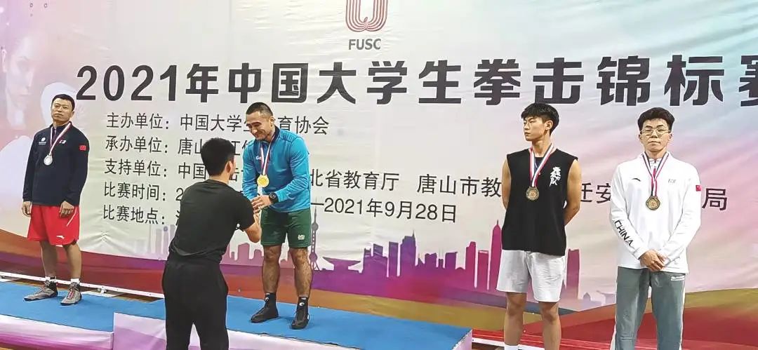 在2021年中国大学生拳击锦标赛中获得75公斤级别男子甲组冠军