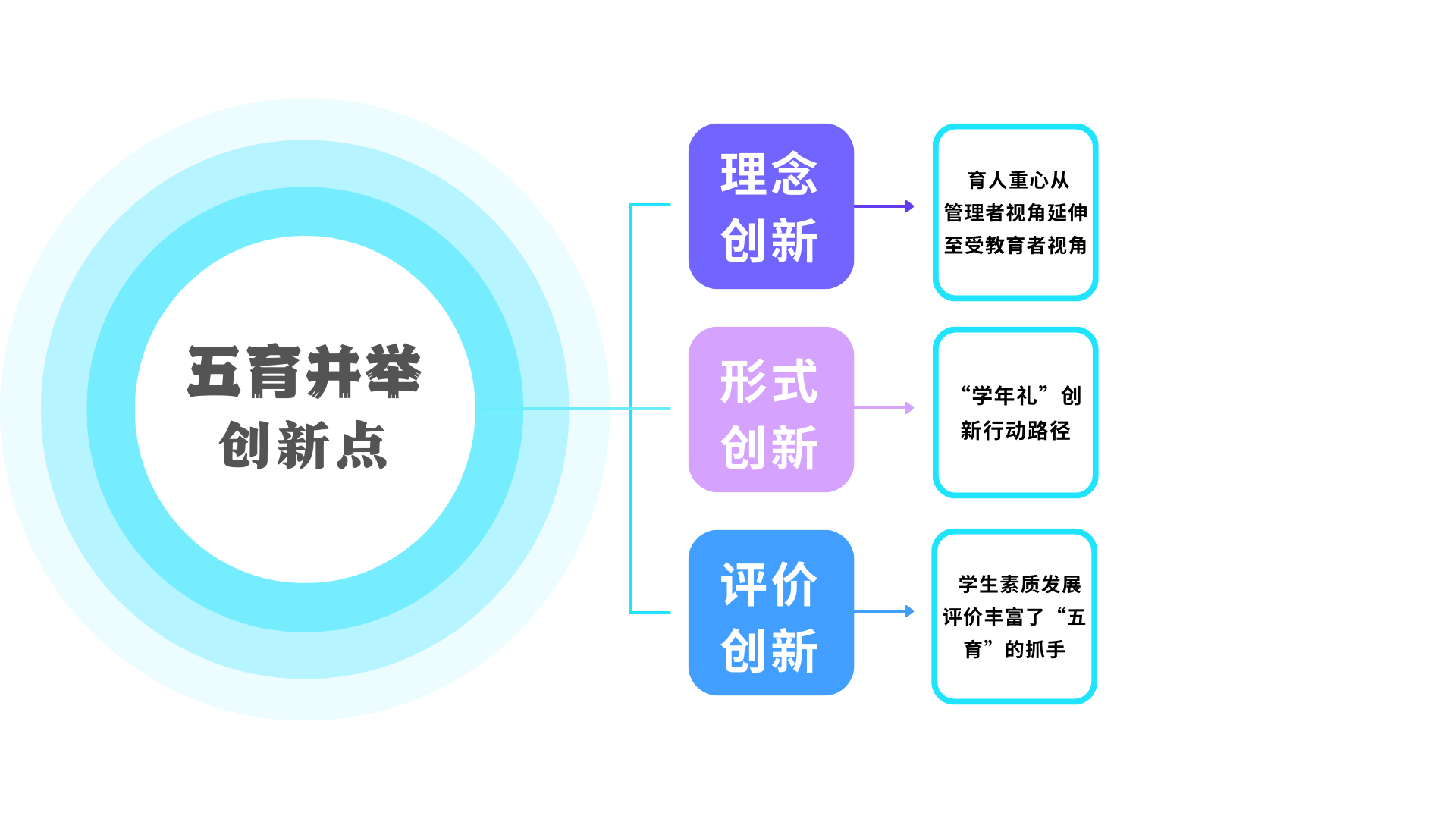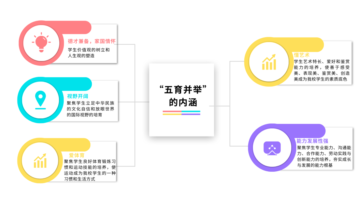 定目标:确立“五育并举”的顶层设计。聚焦“五育”核心内涵,确立“德才兼备、家国情怀、视野开阔,爱体育、懂艺术,能力发展性强”人才培养目标,清晰厘定“五育”的内涵。