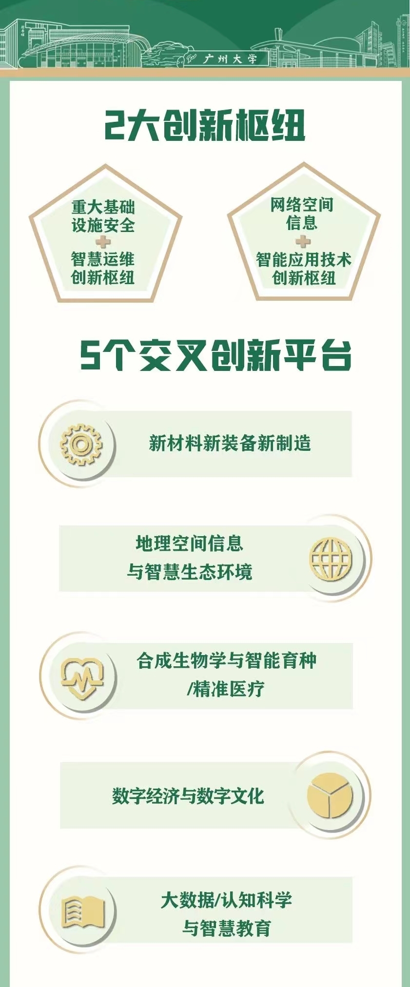 学校全面启动高水平大学建设以来,通过加强人才引进和培育,引进了一大批高水平教学科研人员,师资队伍的质量显著提升,学科底蕴和科研实力持续增强,在“重大基础设施安全+智慧运维创新枢纽”“网络空间信息+智能应用技术创新枢纽”等 2 大创新枢纽和“新材料新装备新制造交叉创新平台”“地理空间信息与智慧生态环境交叉创新平台”“合成生物学与智能育种/精准医疗交叉创新平台”“数字经济与数字文化交叉创新平台”“大数据/认知科学与智慧教育交叉创新平台”等 5 个交叉创新平台,形成了一批学科和人才团队小高原、科技创新小高地。